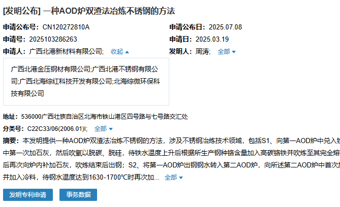 2025年7月8日,廣西北港新材料有限公司聯(lián)合廣西北港不銹鋼有限公司等多家公司成功申請(qǐng)一項(xiàng)名為“一種AOD爐雙渣法冶煉不銹鋼的方法”專利,申請(qǐng)公布號(hào)為CN120272810A,申請(qǐng)日期為2025年3月19日。